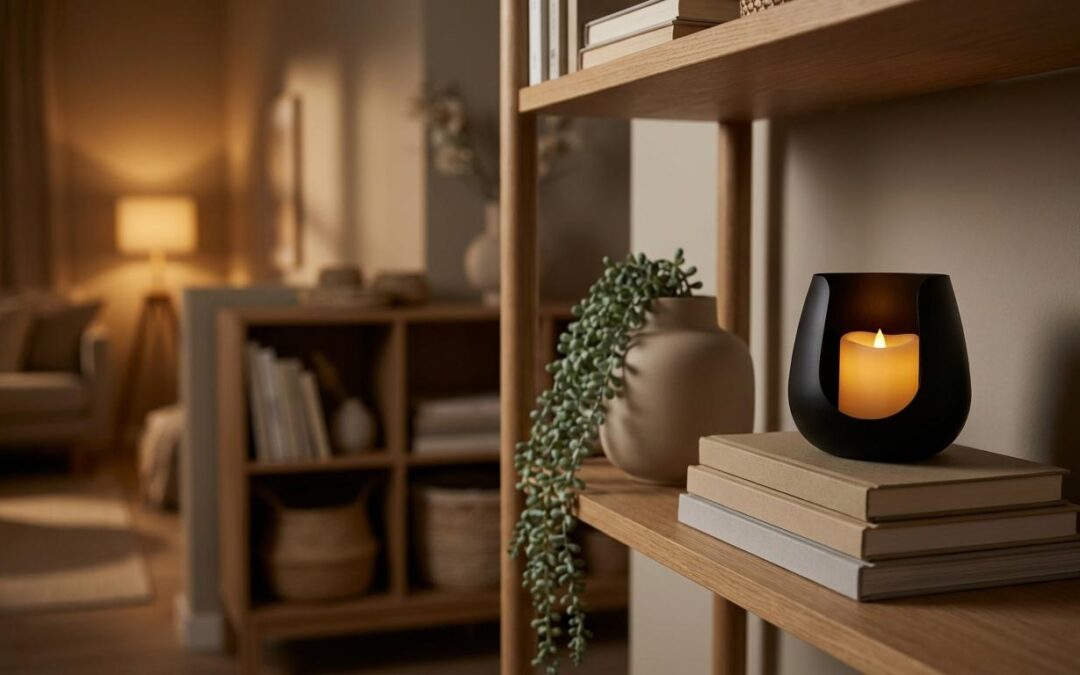 Hvis du vil have et hyggeligt udtryk, så prøv at tilføje lys på hylderne. LED-lys, små lamper eller stearinlys i stager giver en aftenro, som gør selv en enkel reol mere indbydende.