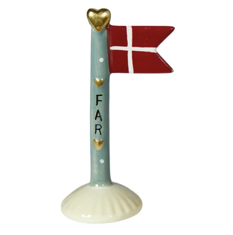 Denne dekorative Dannebrogsflag-figur med teksten “Far” er en personlig og kærlig gaveidé, der hylder en helt særlig far. Bordflaget er udført i keramik og dekoreret med små gyldne hjerter, som giver figuren et varmt og meningsfuldt udtryk.