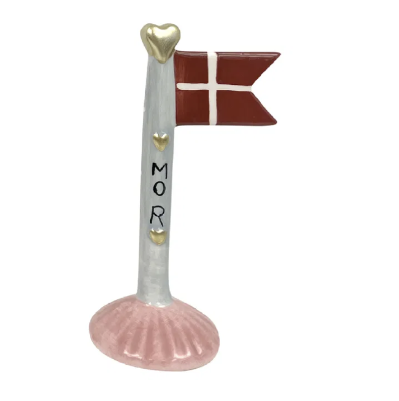 Denne keramik bordflag med teksten “Mor” er mere end pynt – det er en følelse støbt i smuk, dansk tradition. De bløde farver i pink, mint og hvid kombineret med det klassiske Dannebrog og gyldne hjerter skaber et varmt og kærligt udtryk, som straks taler til hjertet. Perfekt som gave til mors dag, fødselsdag eller enhver anledning, hvor Mor fortjener lidt ekstra opmærksomhed. Den står elegant på skrivebordet, reolen eller bordet og minder hende dagligt om, hvor værdsat hun er.
