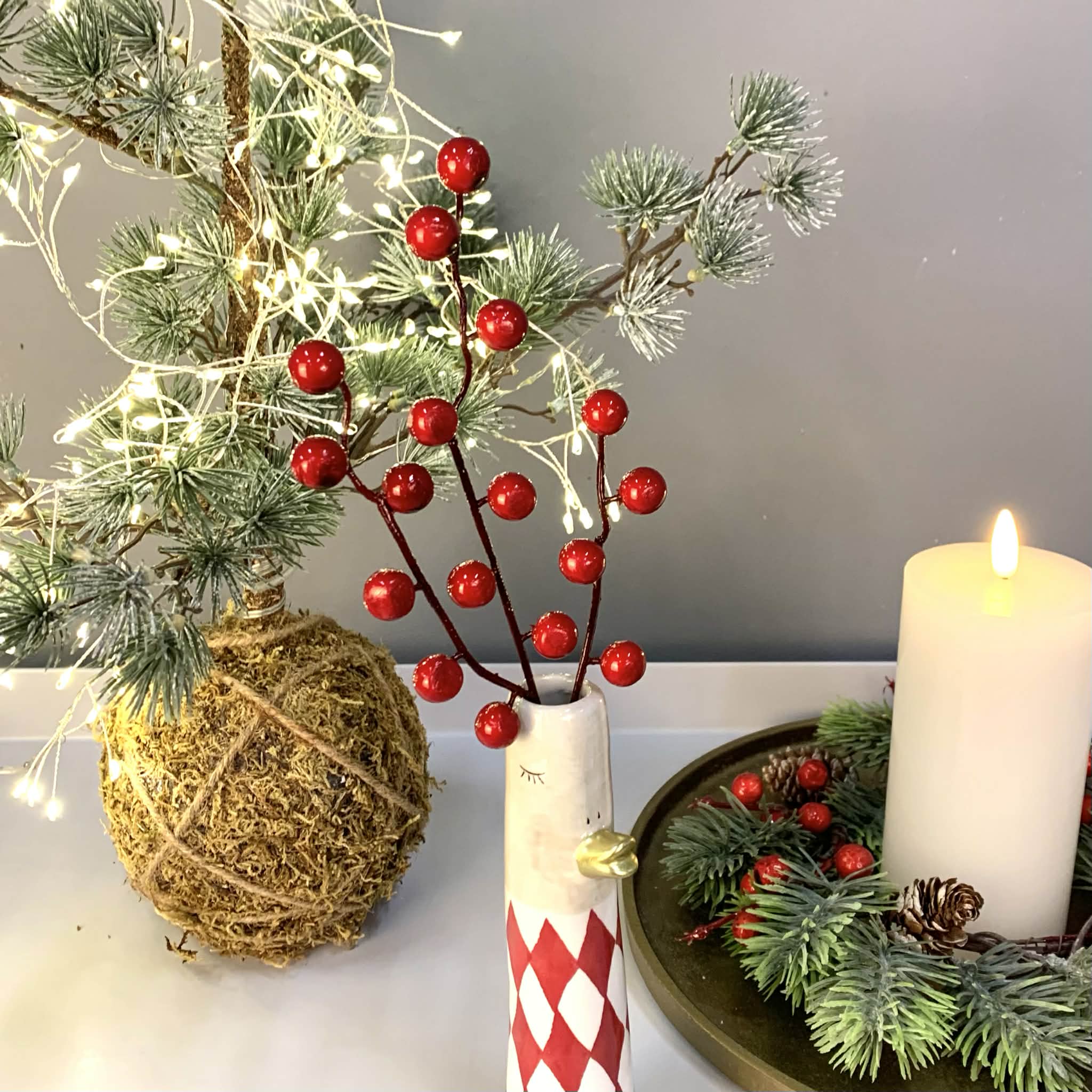 Skøn kunstig gren med røde bær – brug den i juledekorationen