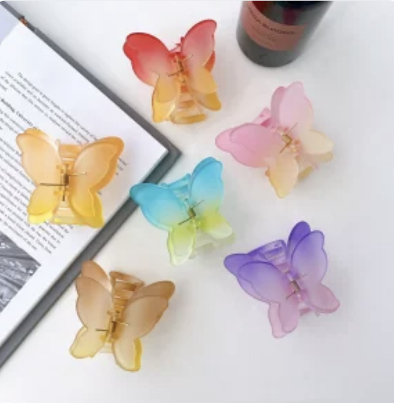 Elegant hårklemme formet som en sommerfugl i let transparent design med bløde farveovergange. Giver et feminint og legende udtryk og holder håret sikkert på plads – perfekt til både hverdag og fest. 🦋✨