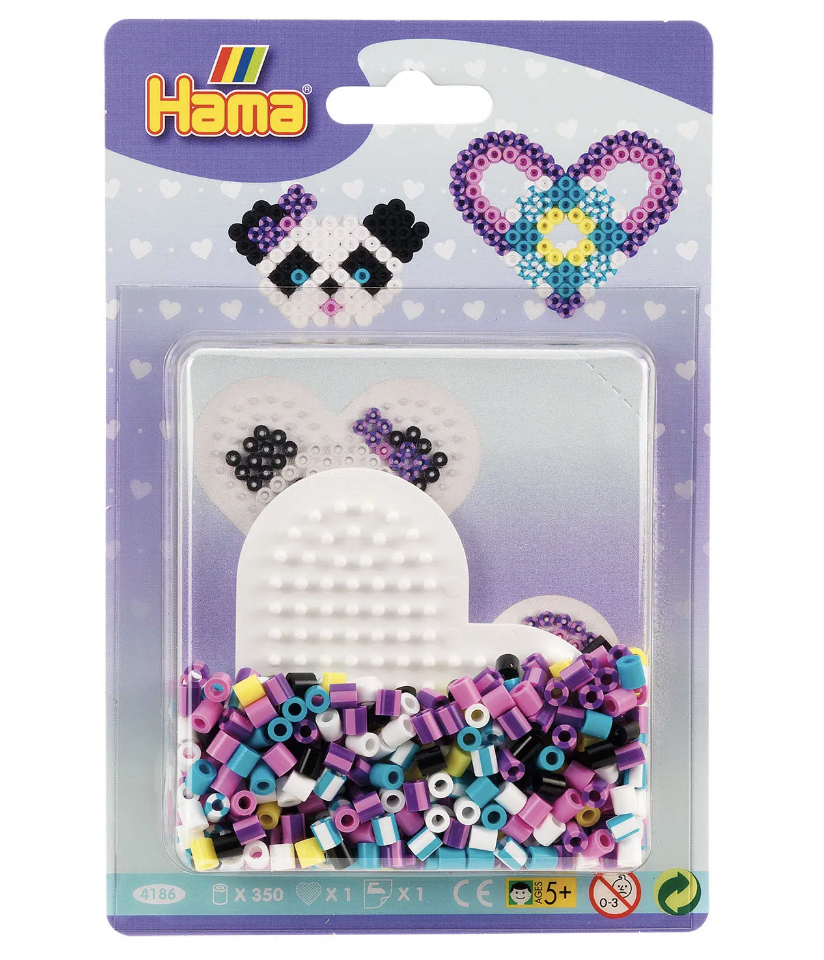 Kreativt Hama Midi Hjerte/Panda sæt med ca. 450 perler, stiftplade og strygepapir. Perfekt til sjov leg, kreativ udfoldelse og udvikling af finmotorik hos børn fra 5 år.