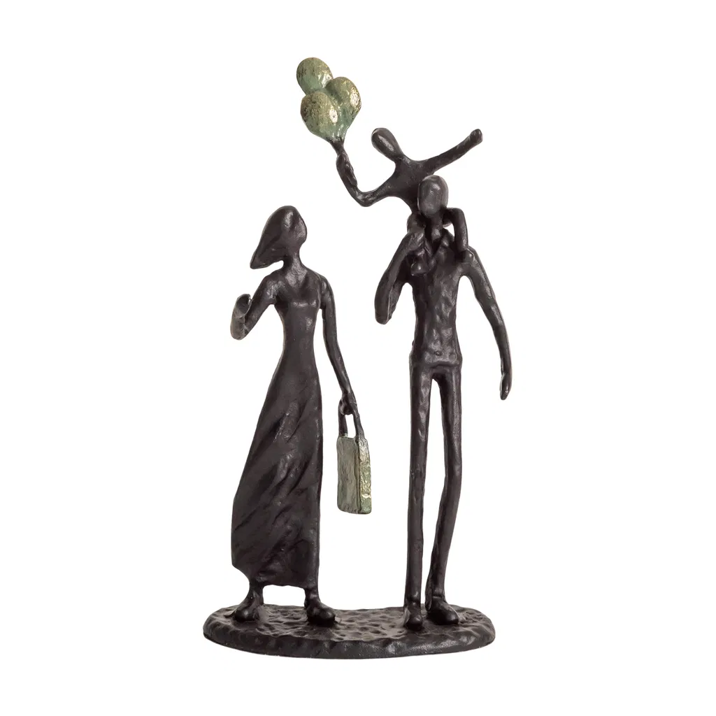 Smuk sort og grøn metalfigur af en glas familie på tur med balloner.