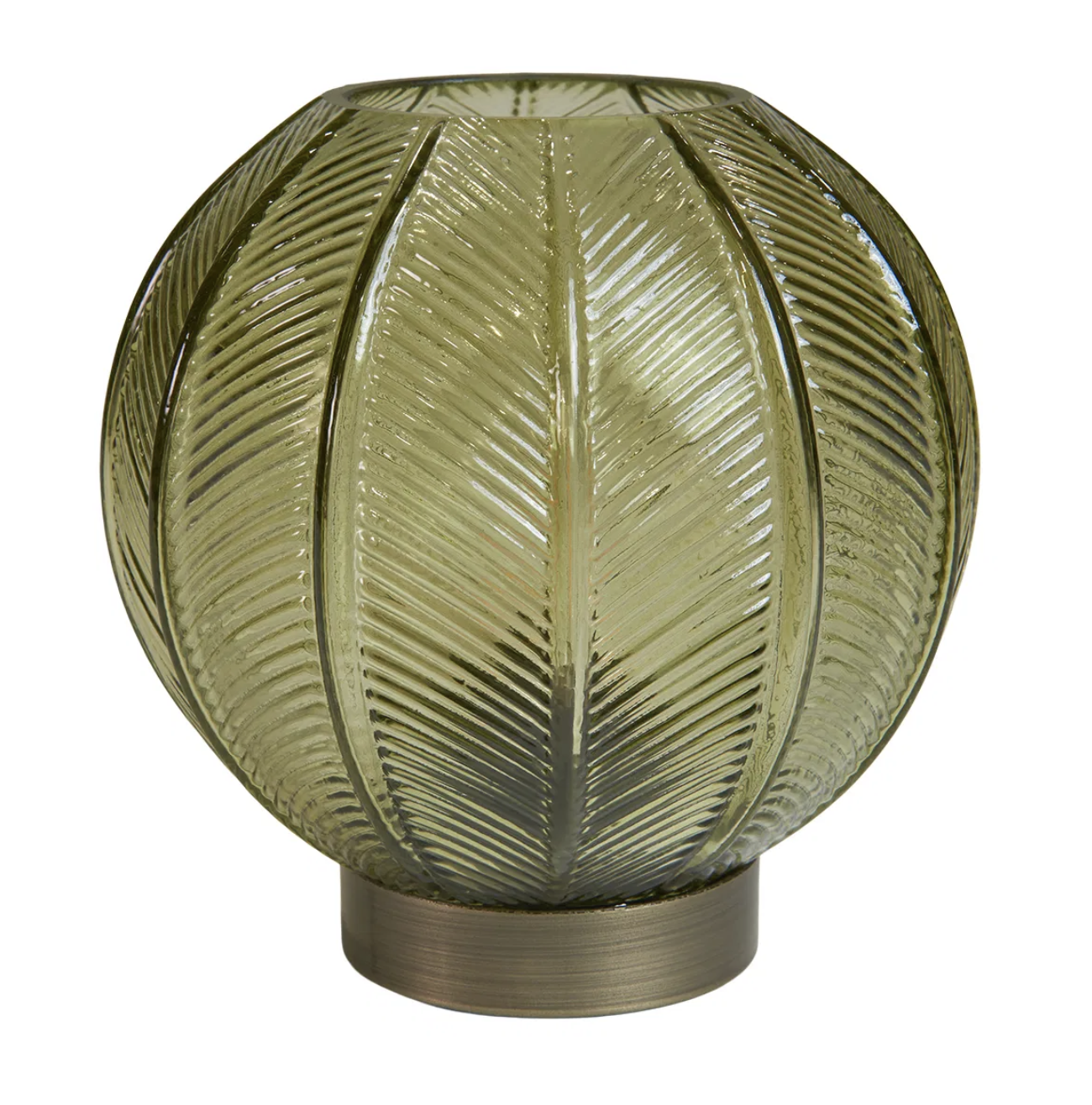Lampe kugle LED D15x15 cm i grønt glas er mere end blot belysning – den er et stemningsskabende designelement, der tilfører dit hjem varme og eksklusivitet. Den kugleformede lampe er inspireret af naturens rolige former og dekoreret med et fint bladmønster, som giver et levende spil i lyset. Det bløde LED-lys reflekteres smukt i det transparente glas og skaber en hyggelig atmosfære, mens den messingfarvede fod tilfører raffineret kontrast og stabilitet. Perfekt til dig, der ønsker indretning med personlighed og sans for detaljen.