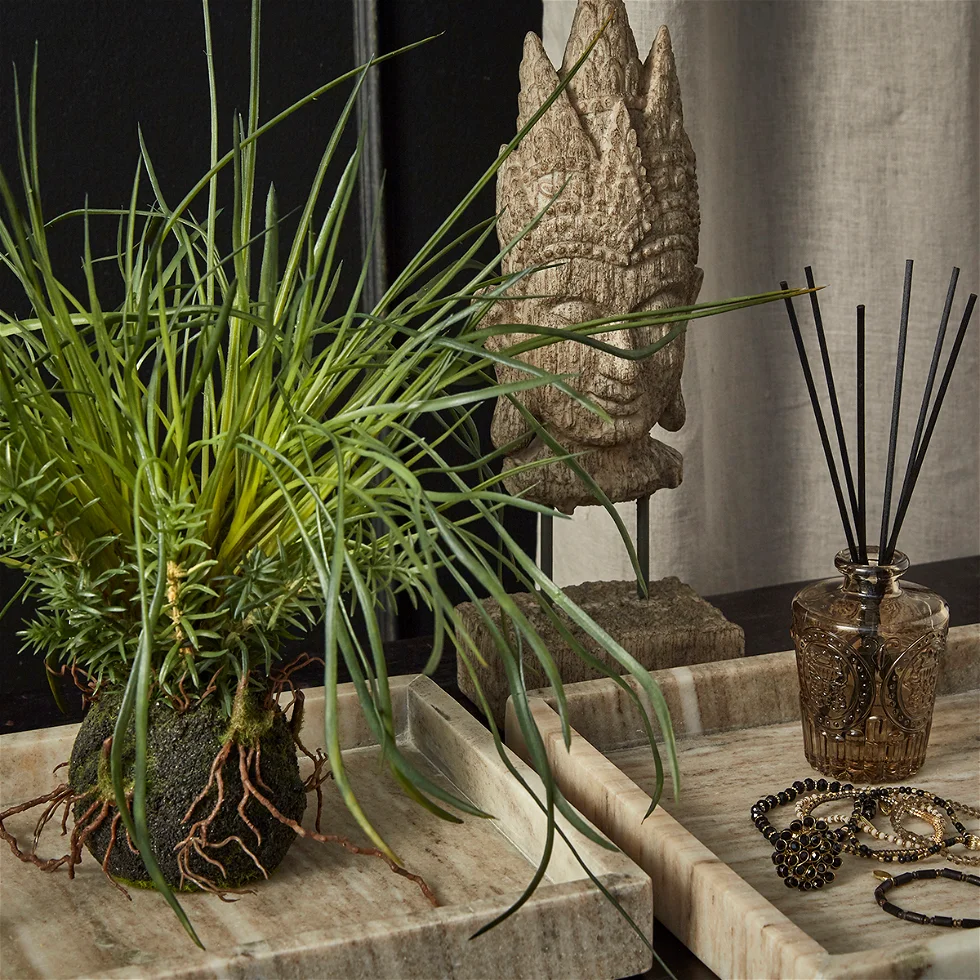 Fadet er fremstillet i marmor, hvilket giver hvert enkelt fad sit eget unikke udtryk med naturlige variationer i farve og struktur. Den praktiske kant gør det ideelt til at samle og fremhæve dine yndlingsdekorationer – fra lys og vaser til sæber, smykker eller krydderier.