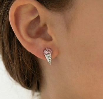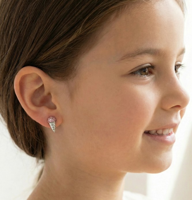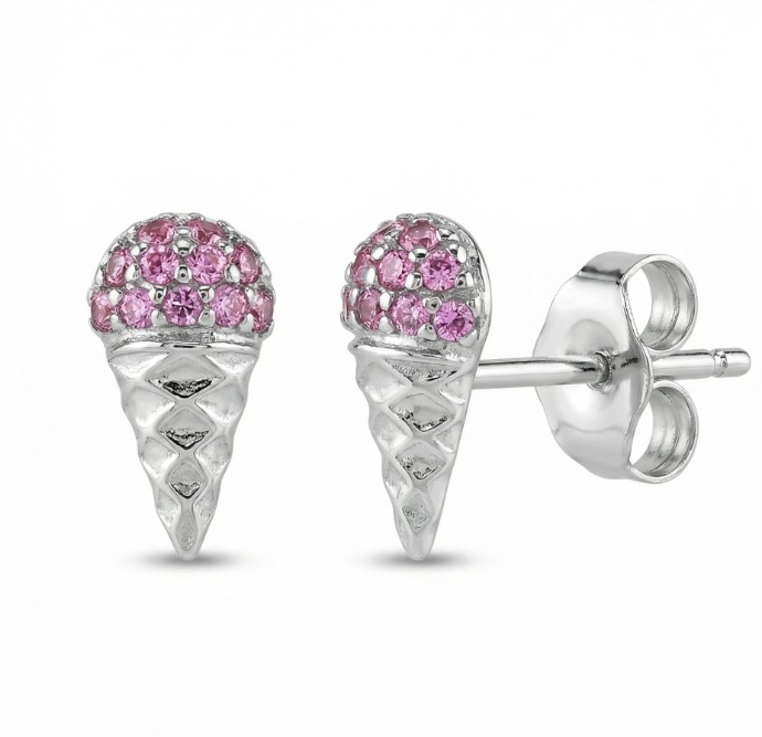 **Ørestikkere Isvaffel Sølv** forener legende charme med raffineret kvalitet. Formet som små isvafler i sterlingsølv og lyserøde sten. Et hjertevarmt smykke, der skaber glæde hos både børn og voksne – perfekt som gave eller selvforkælelse.