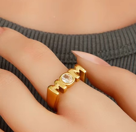Fin bogstavring med “MOM i 18K guldbelagt rustfrit stål