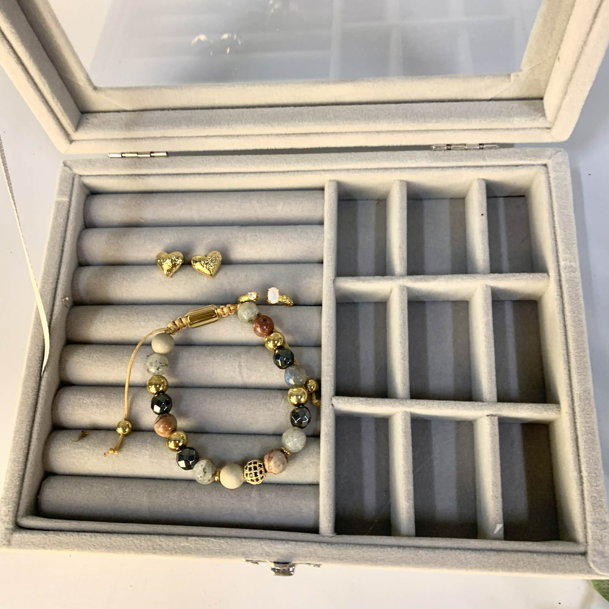 Smukt og enkelt smykekskrin i grå velour til god opbevaring af dine smykker. Der er vindue i låget så man kan se ind til herlighederne.