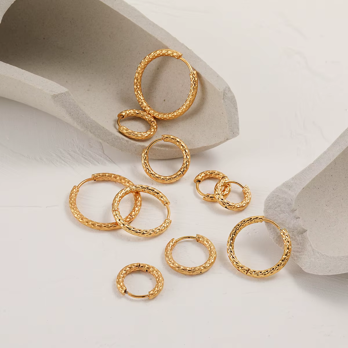 Øreringene er fremstillet i rustfrit stål med 18K guldbelægning, hvilket gør dem vandfaste, slidstærke og modstandsdygtige over for anløbning. Et tidløst smykke, der bevarer sin smukke glans – også ved daglig brug.