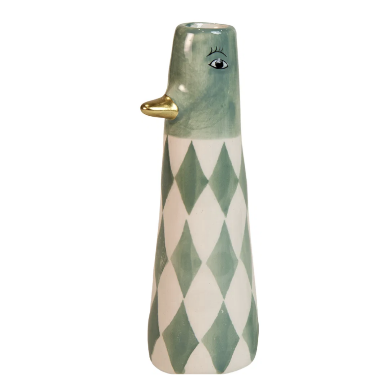 Denne dekorative keramiske fuglefigur i Harlekin grøn er et lille kunstværk, der tilfører personlighed og stil til dit hjem. Det grafiske harlekinmønster, det elegante øje og det guldfarvede næb skaber et eksklusivt udtryk, som fanger blikket. Den slanke form passer perfekt ind i nordisk, moderne og kreativ indretning.