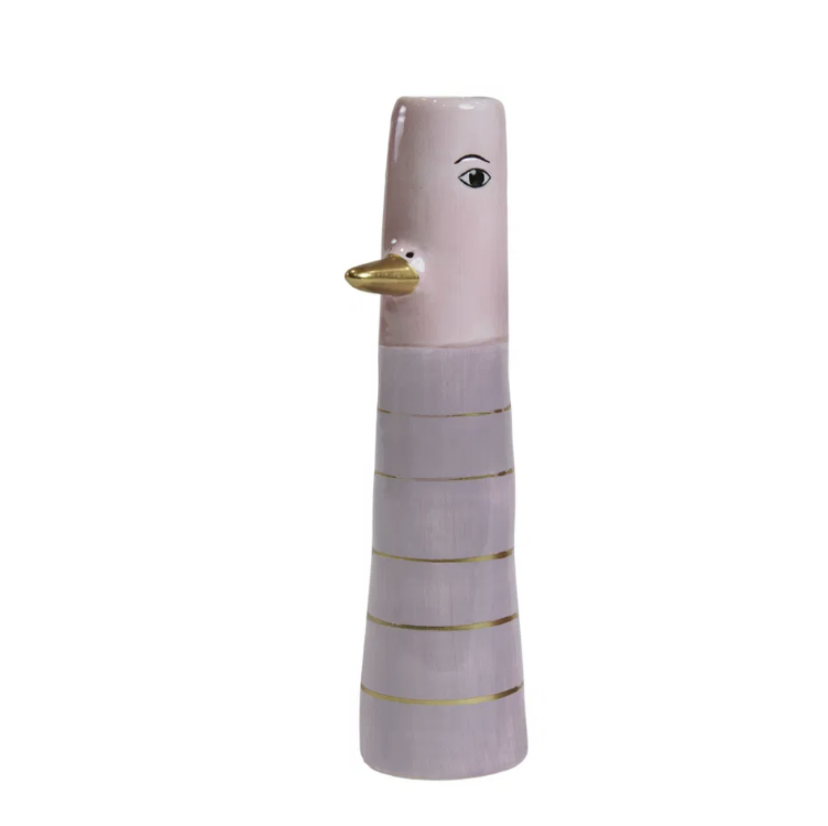 Denne keramiske fuglefigur i lilla og lyserøde nuancer er skabt til dig, der ønsker boligpynt med både personlighed og ro. Den slanke form, de bløde farveskift og de fine horisontale gulddetaljer skaber et eksklusivt udtryk, der løfter indretningen uden at dominere. Med sit stiliserede ansigt og guldfarvede næb udstråler figuren håndværk, balance og moderne nordisk elegance.