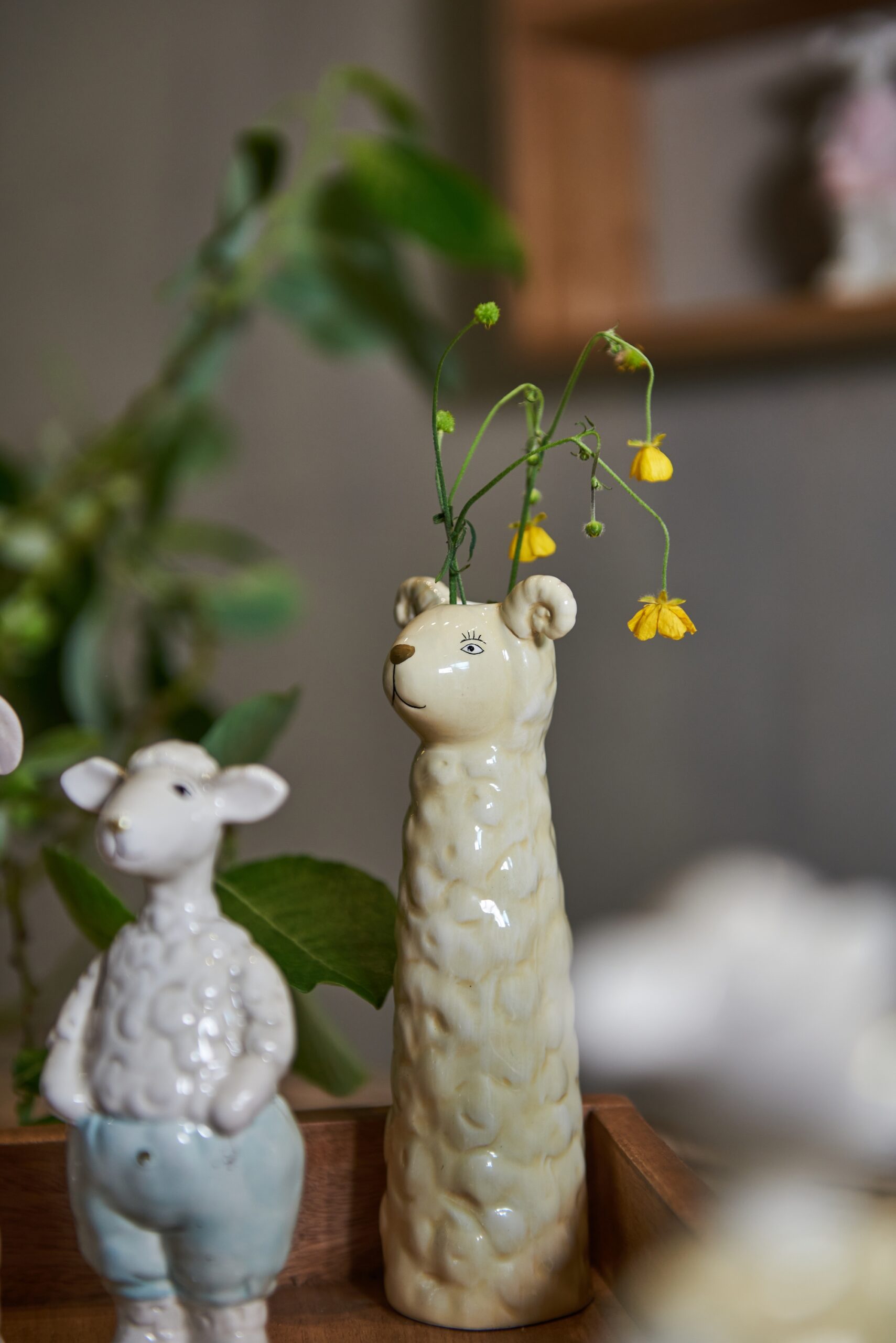 Vase Får H18 cm i gul keramik er en indbydende dekoration, der straks skaber hygge og personlighed. Det venlige udtryk, de håndmalede detaljer og den bløde glasur giver et roligt, harmonisk look, som føles både tidløst og moderne. En figur, der taler til følelserne og gør dit hjem mere levende.