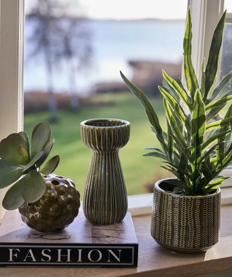 Vase med riller D10x20cm er en stilren keramisk skønhed med elegant, riflet design i naturlige grønne og beige nuancer. Den glaserede overflade giver et moderne, levende udtryk, hvor farvespillet gør hver enkelt vase unik. Formen tilfører varme og hygge og løfter din indretning med et eksklusivt, nordisk præg.